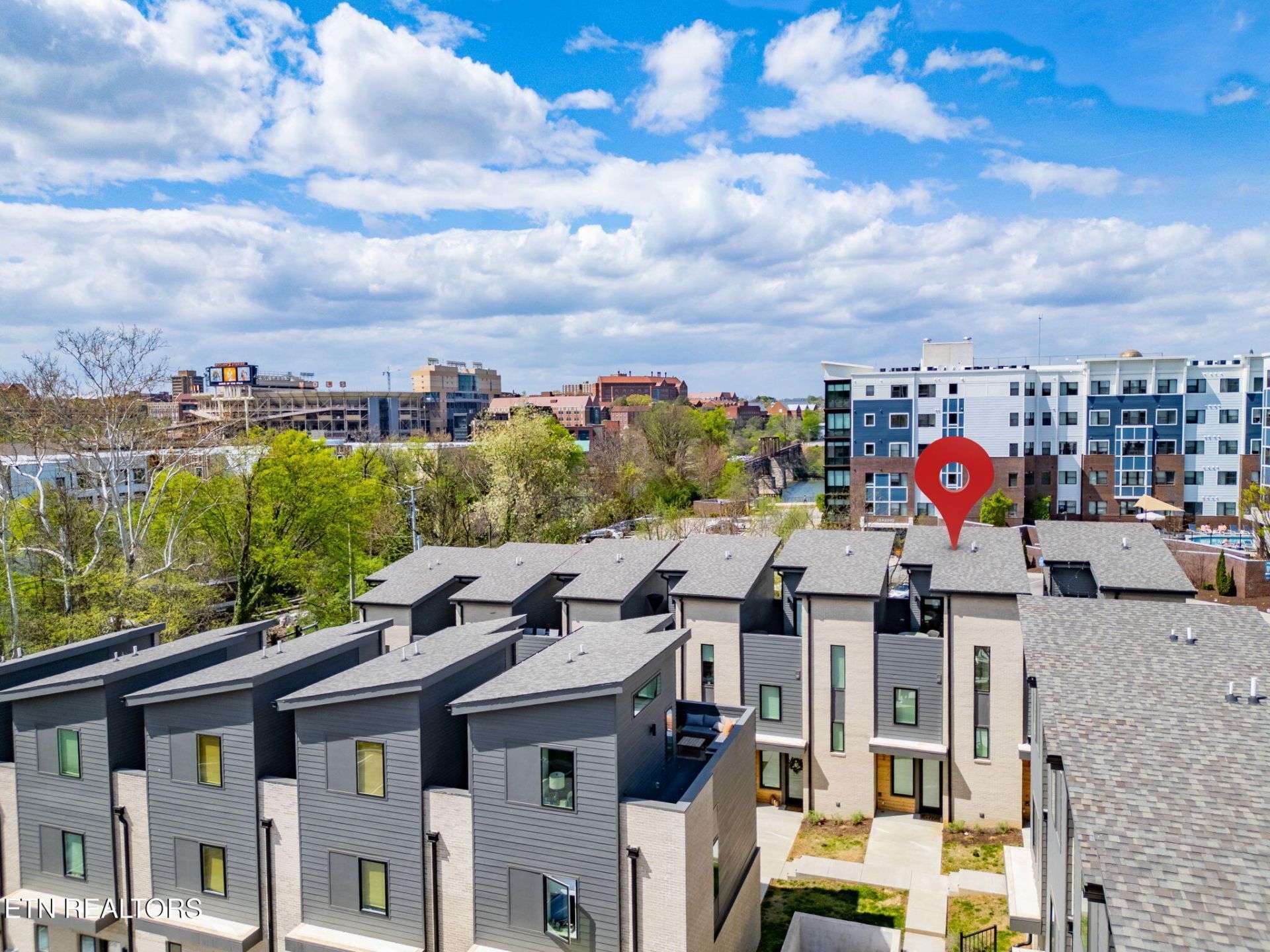 Sophisticated, modern, and impeccably located--this 2023-built South Waterfront District townhome offers an elevated take on urban Knoxville living. Spanning 1,318 square feet, this 1 (or 2) bedroom, 1.5-bath residence showcases refined, high-end finishes including hardwood flooring throughout, designer tile, and a sleek, quartz-appointed kitchen and bath, tall ceilings, and extra-large windows.A deck on the first floor and an oversized rooftop terrace on the top floor provide a rare and luxurious outdoor escape, ideal for entertaining or unwinding.A spacious top-floor flex room adds exceptional versatility, easily functioning as a sophisticated home office, second living area, a second bedroom, or guest retreat.Located just 3 minutes from downtown Knoxville and the University of Tennessee campus, this home places you across from Kerns Food Hall and Mimosas Restaurant, and just steps from the entrance to the SoKno Rail Trail with direct access to Ijams Nature Center.Short-term rental eligible with projected income around $35,000 annually, this property offers a rare blend of luxury, lifestyle, and investment potential.
